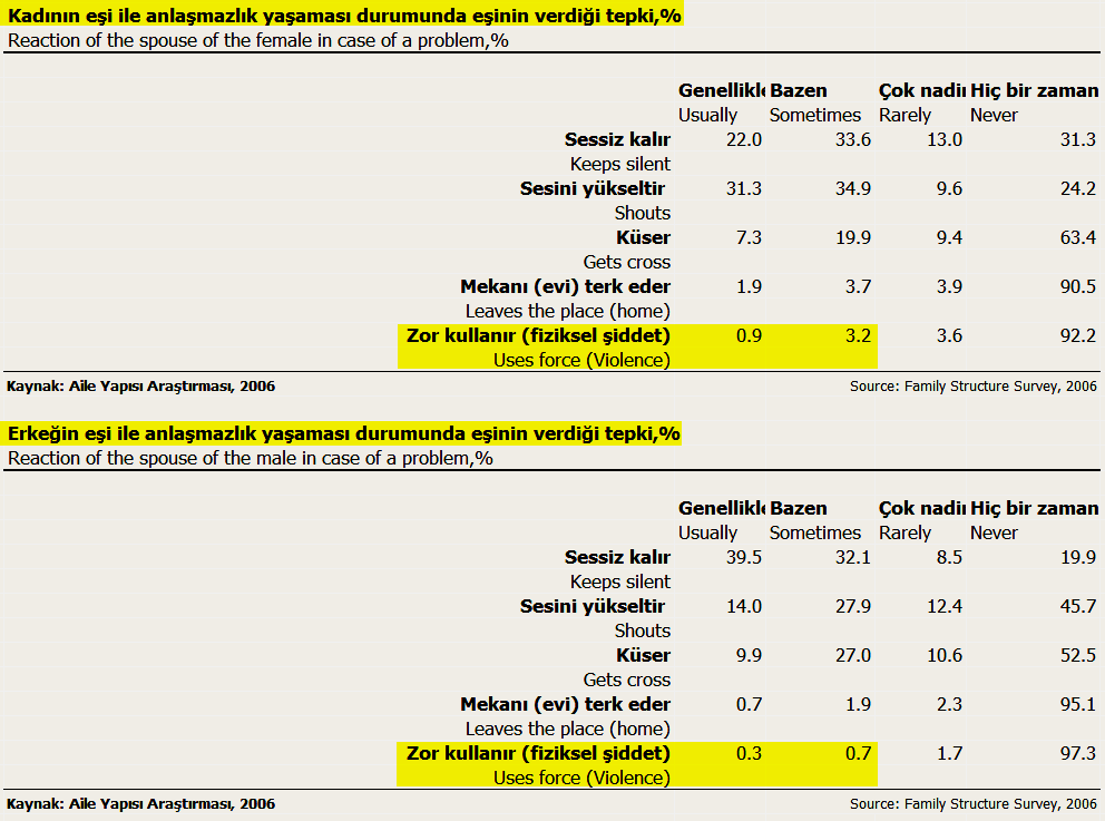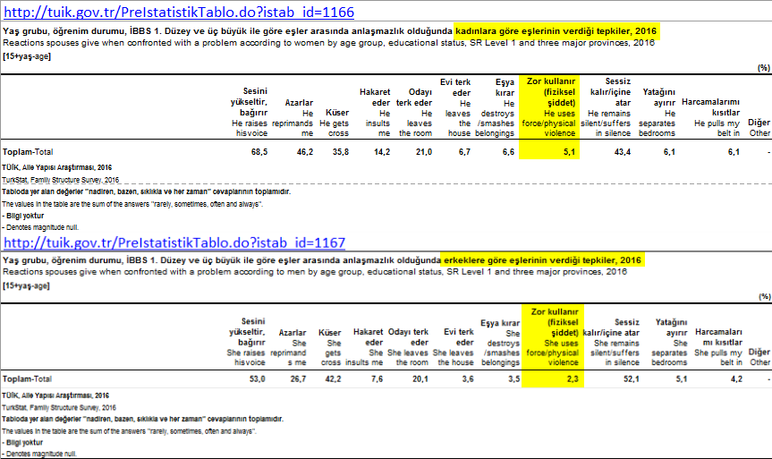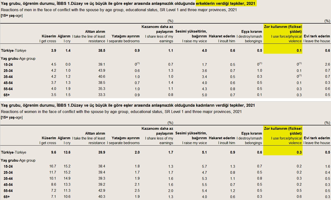 Yalan söylemeye ant içmiş Türk basınında “aile içi şiddetin” çoğunlukla kadından erkeğe yöneldiği haberini göremeyeceksiniz. Bir kadının kocasına zorbalık etmesinin ender, “münferit” olay olduğunu öne süren uzman kılıklı soytarıları çıkaracaklar. 2021 araştırmasında kadının zorbalıkta erkeğe fark atmasının yanı sıra eşine sesini yükseltmekte ve hakaret etmekte daha korkusuz olduğuna dikkat edin. Konunun fiziksel olarak kimin neye güç yetirebildiğiyle hiçbir ilgisi kalmamıştır çünkü Türk erkeği karısından dayak yerken polis, savcı ve hakim onun kollarını tutuyor. Bu istatistikler, zorbalık gören erkekleri yok sayarken zorbalık gören kadınların istatistiğini özellikle yayınlayarak hükümetin etkin bir ayrımcılık yapmasına karşın elimizde bulunanlar. Adil bir veri işleme politikası izlenmesi durumunda zorbalığın kadından çok erkeğin aleyhine olduğunu çok daha net göreceğimizi söyleyebiliriz.